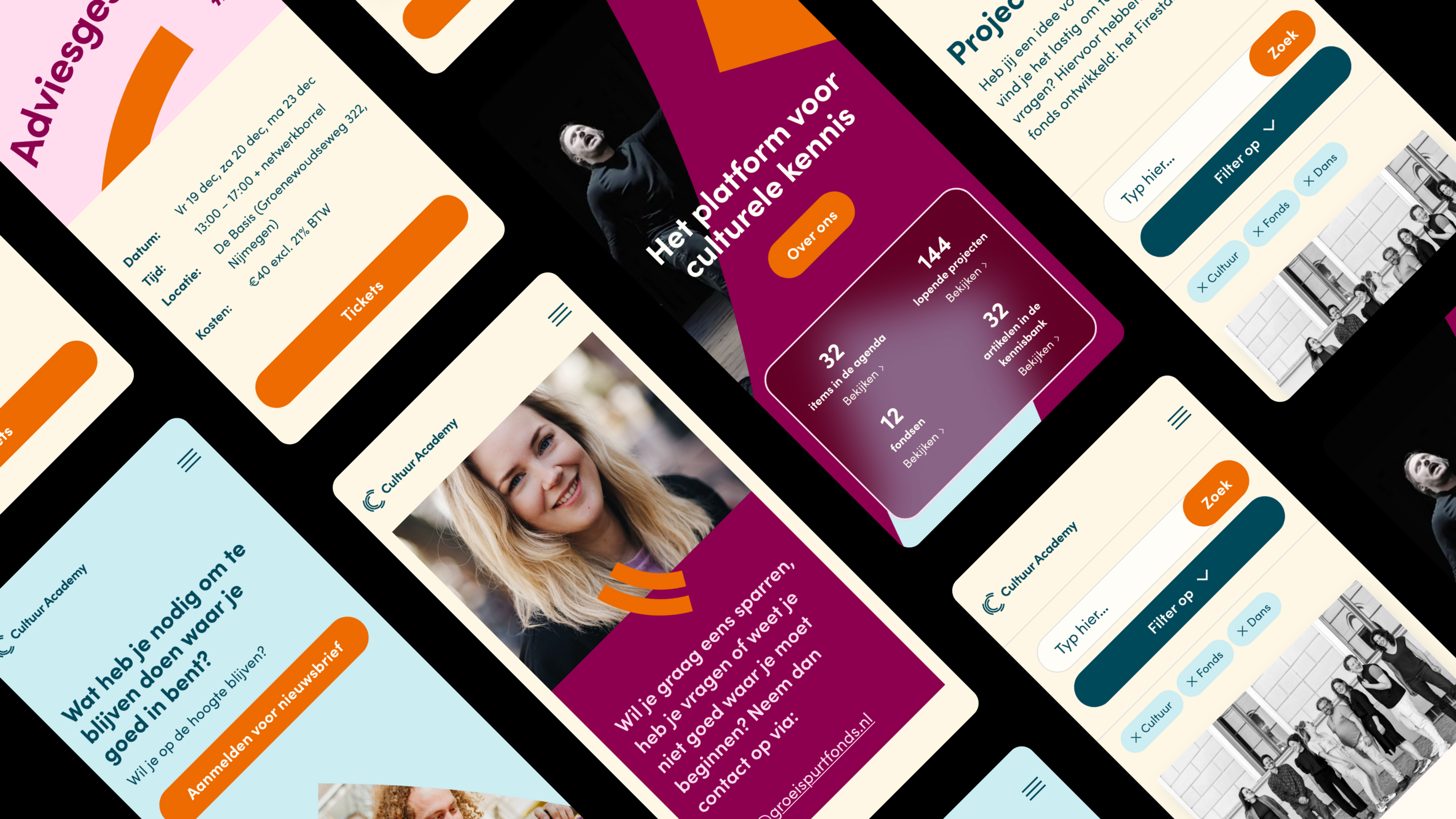 The cultuuracademy.nl platform has a wide range of content like events and workshops, a knowledge base, different types of funds, projects, people and more. To make sure all this content remains comprehensible while also making the brand shine we spent a lot of time creating a solid and accessible design system. The admins can create their own content using a custom made article-builder with building blocks for text, images, video and so much more.